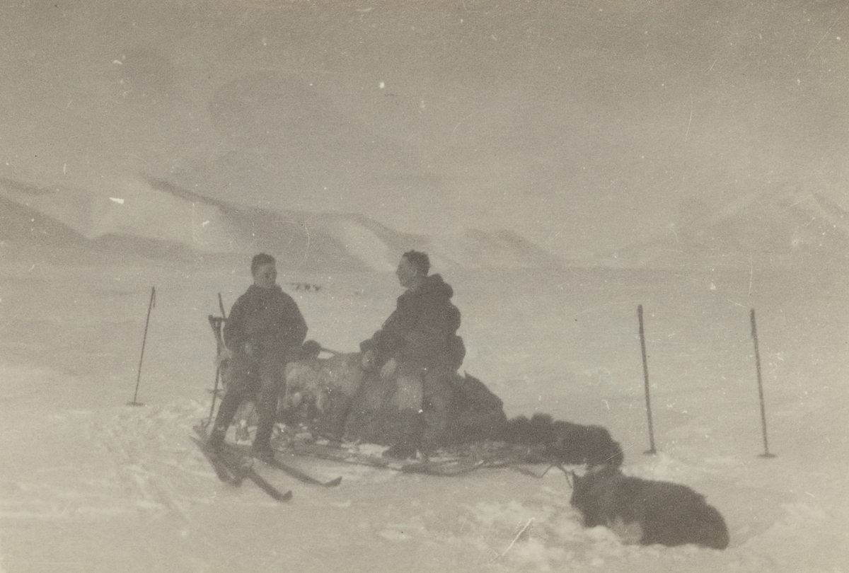 Fotografi från expedition till Spetsbergen. Motiv av två män och hundspann som vilar sig mitt i ett kargt snölandskap.