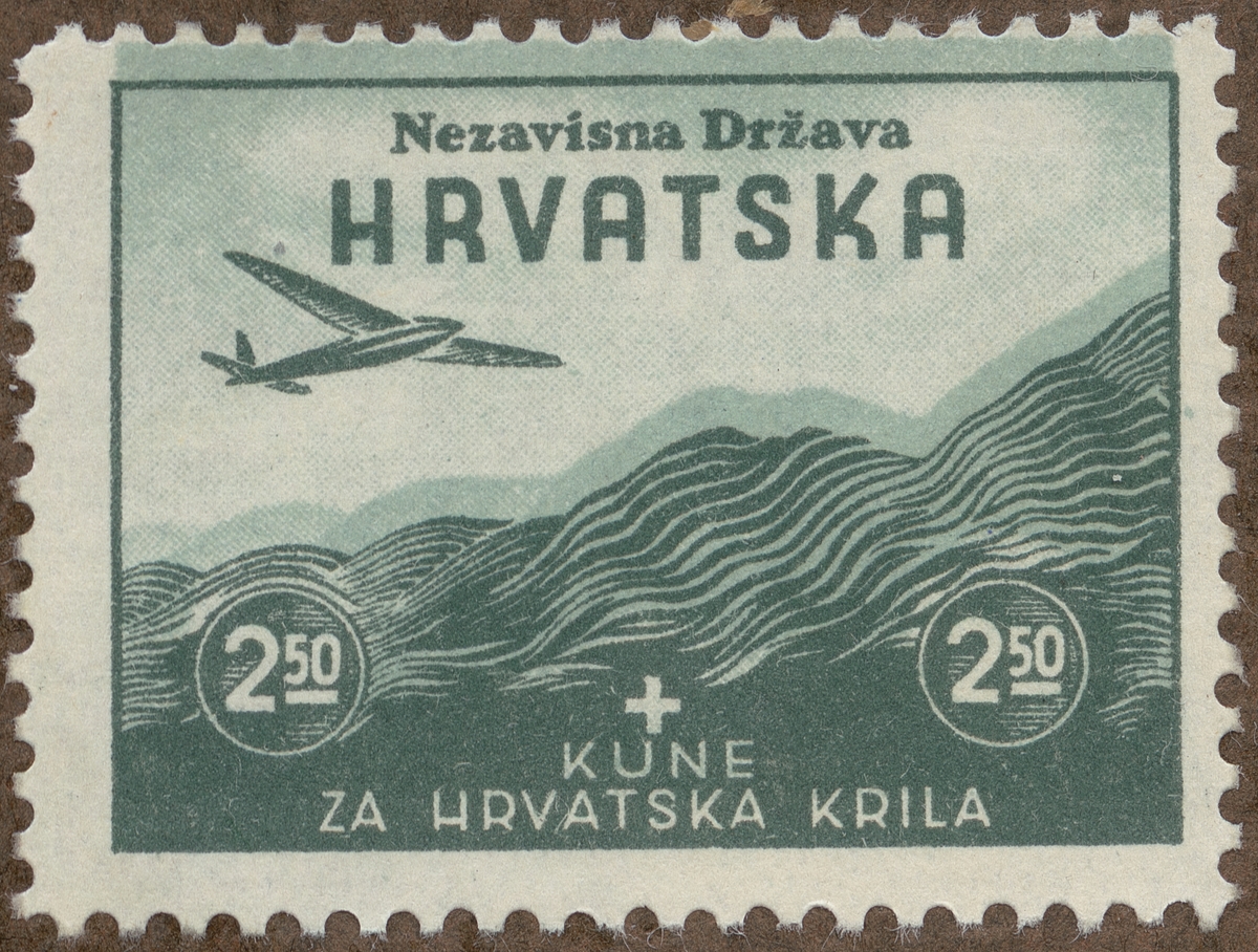Frimärke från Kroatien, 1942. Motiv av Monoplan över stiliserat landskap "Flygserie"