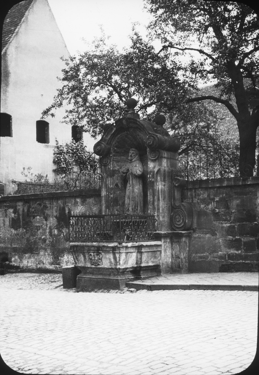 Skioptikonbild med motiv av staty av munk längs gata i Bamberg.