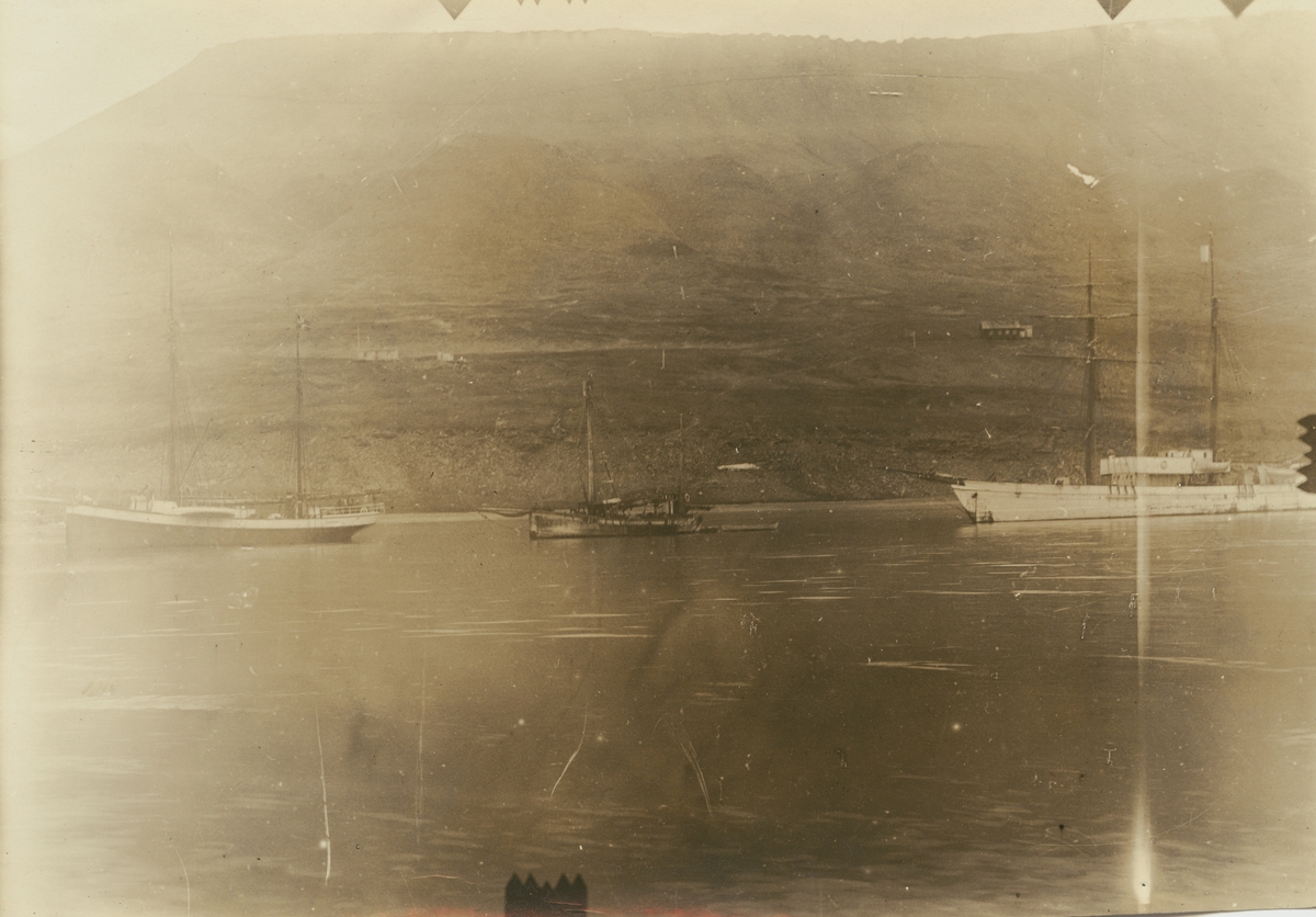 Fotografi från expedition till Spetsbergen 1920. Motiv av tre fartyg i vattnet nedanför berg.