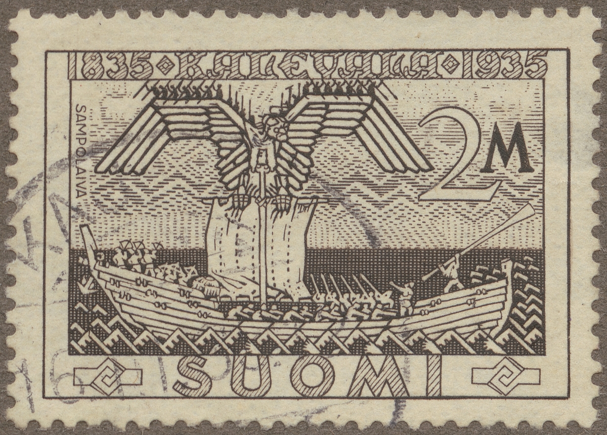 Frimärke från Finland, 1935. Motiv av Vikingaskeppet "Sampo" omtalat i Finlands nationalepos Kalevala. 100-årsminnet av Kalevalas första sammanställning. 1835-1935.