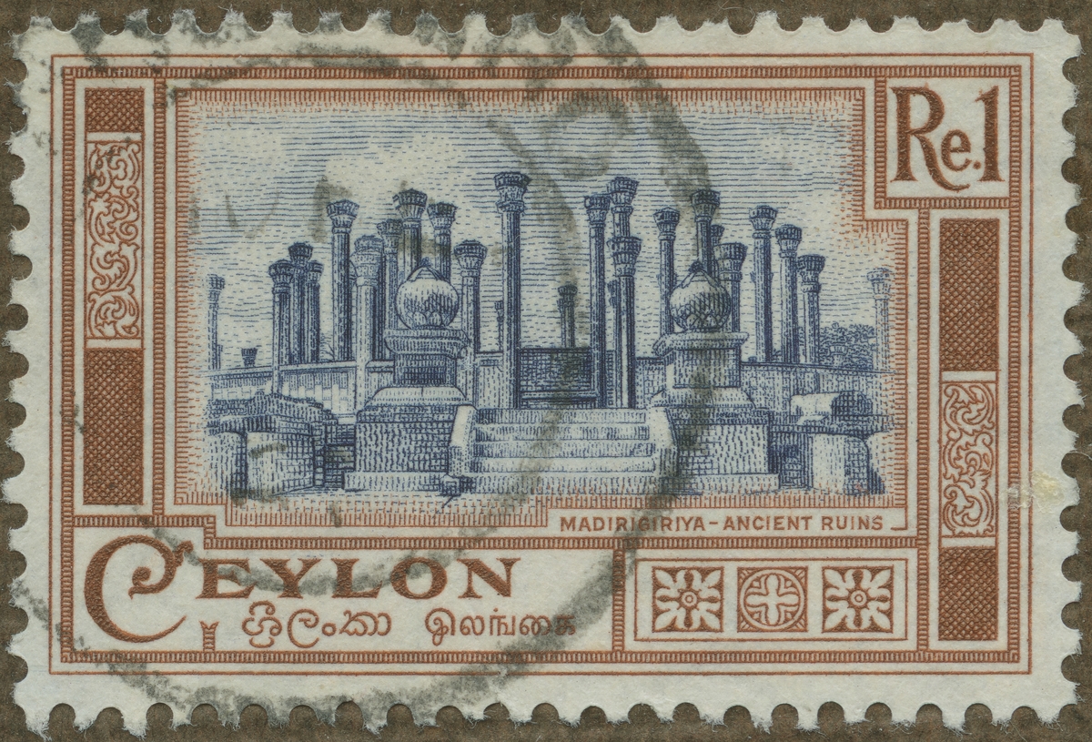 Frimärke från Ceylon, 1950. Motiv av Madirigiriya, ruinrester på Ceylon.