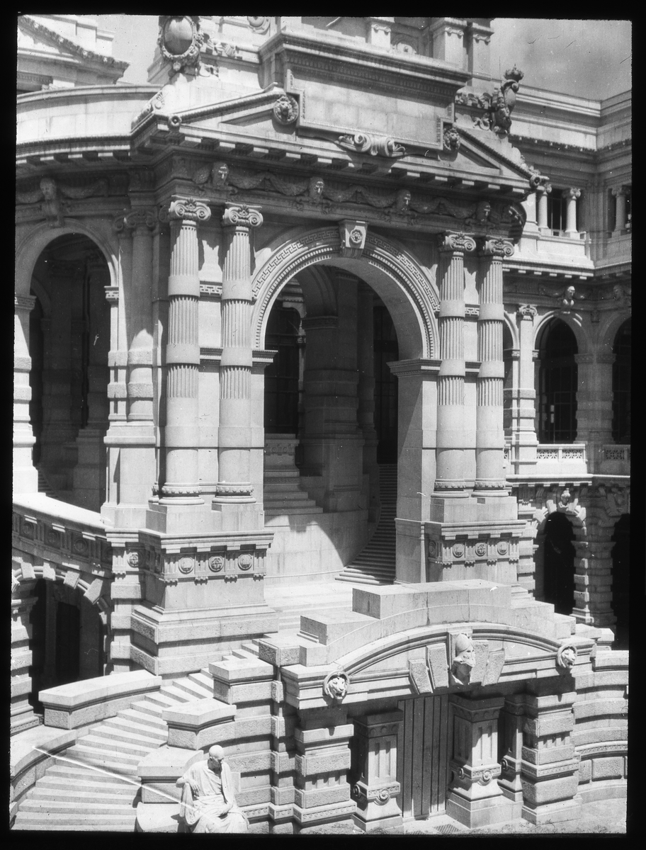 Skioptikonbild från institutionen för fotografi vid Kungliga Tekniska Högskolan. Motiv föreställande en man som sitter och vilar framför en entré i Rom. Bilden är troligen tagen av John Hertzberg under en resa i Europa.
