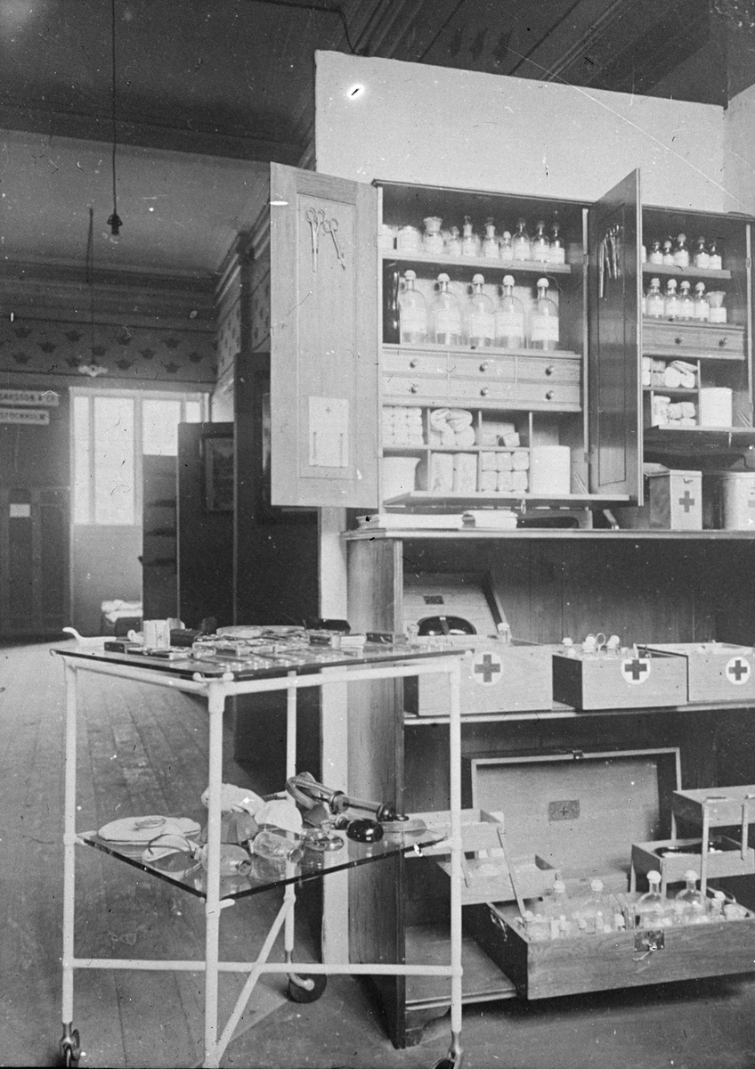Skioptikonbild med motiv från yrkesinspektionens undersökningar på olika arbetsplatser. Medicinskåp.