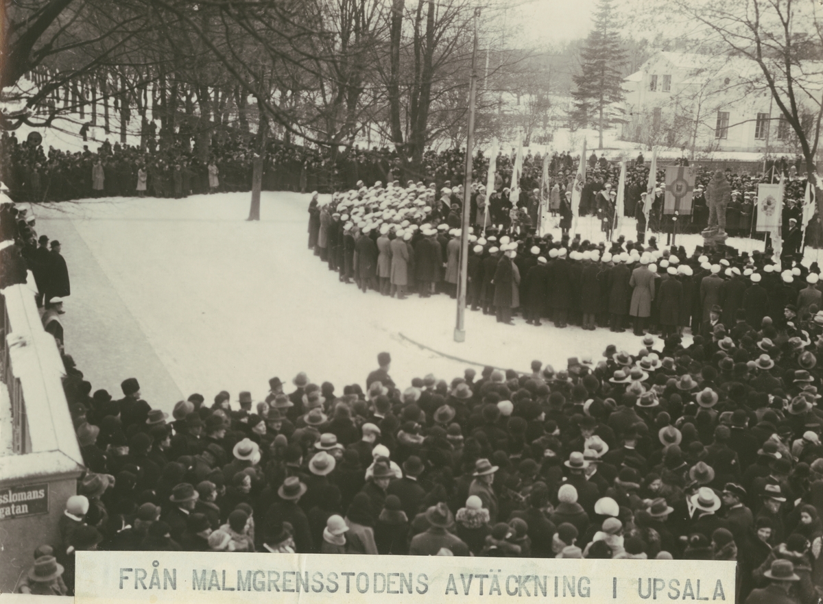 Fotografi från svenska undsättningsexpeditionen 1928. Motiv från avtäckningen av Finn Malmgren-statyn i Uppsala.
