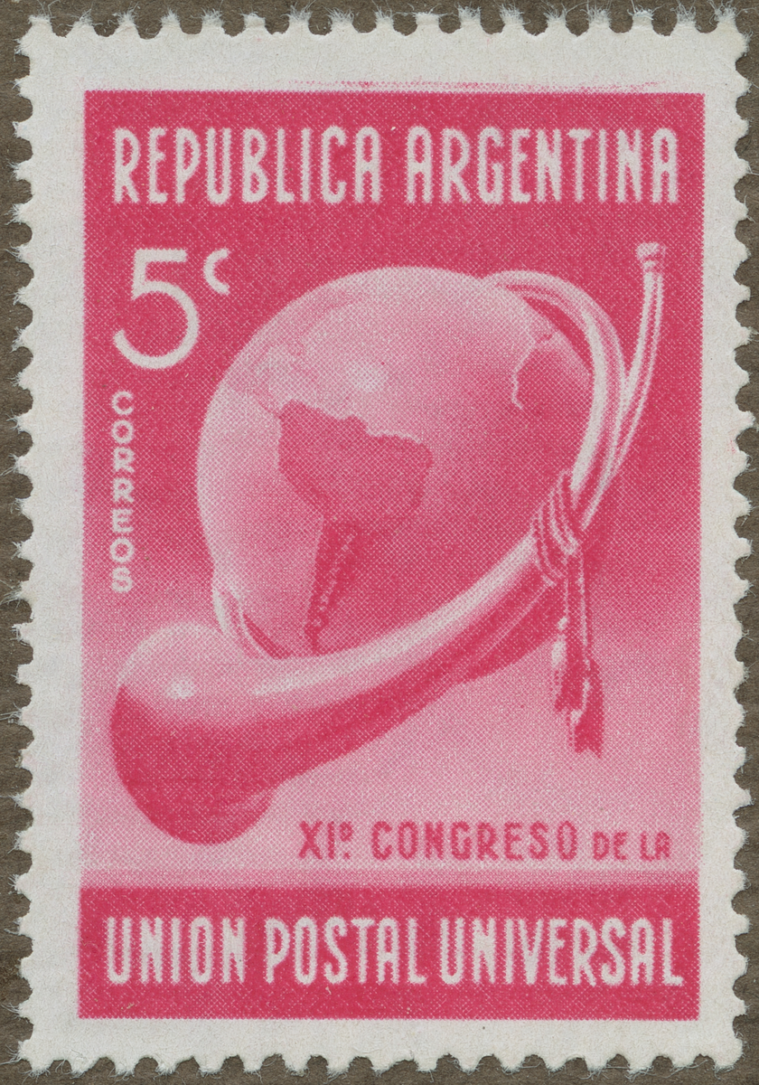 Frimärke från Argentina, 1939. Motiv av Posthorn kring Jordglob Allegori 11-te internationella postkongressen