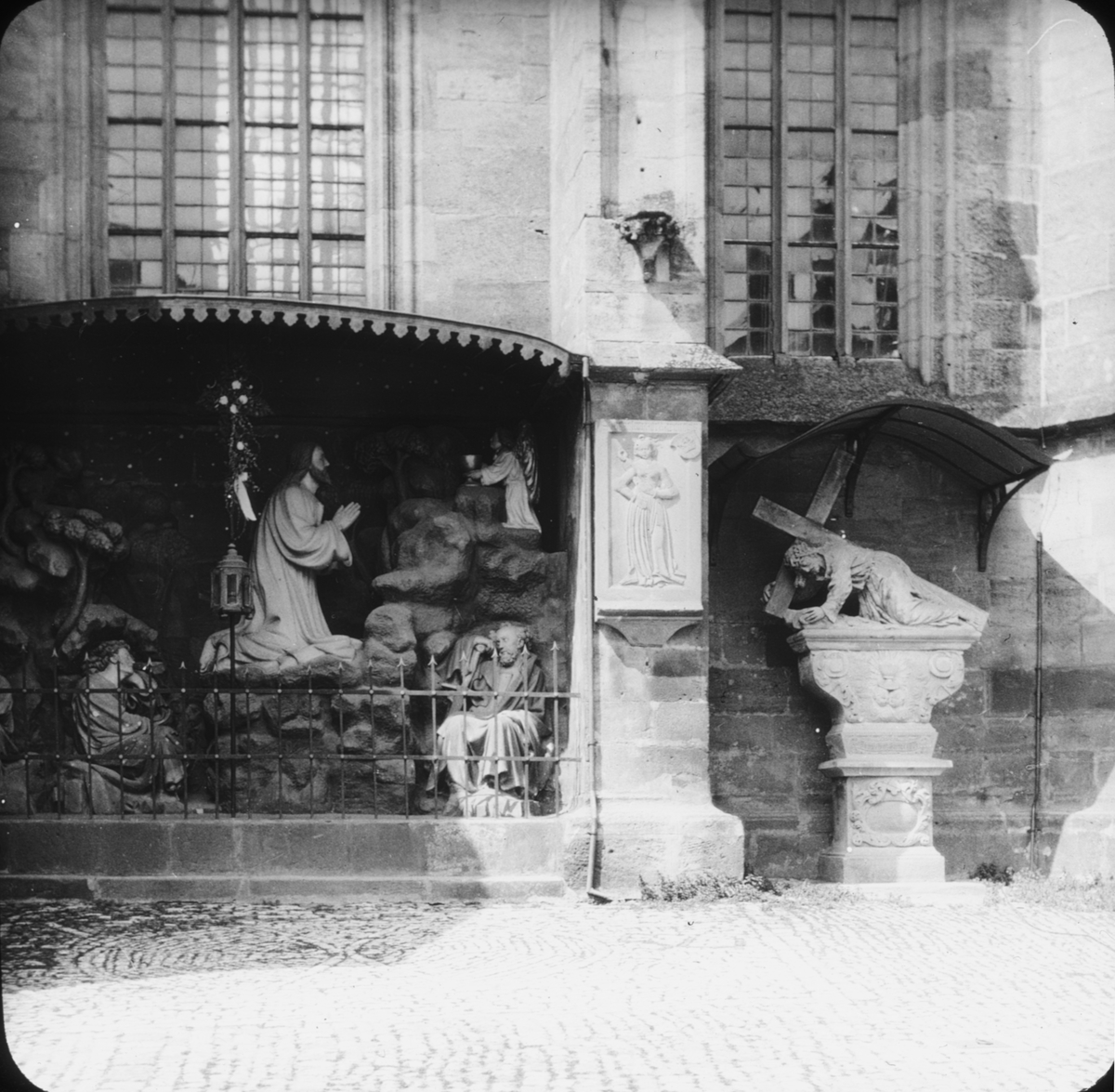 Skioptikonbild med motiv från Iphofen. Religiösa skulpturer framför okänd byggnad.