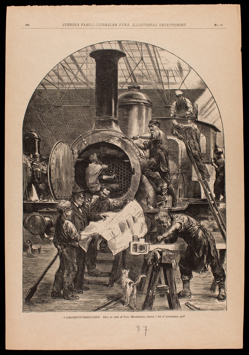 Pressklipp från Svenska Familj- Journalen Svea, illustrerad veckotidning no. 57 sid 452. I lokomotivverkstaden. Efter en tavla av Paul Meijerheim, skuren i trä av konstnären.
