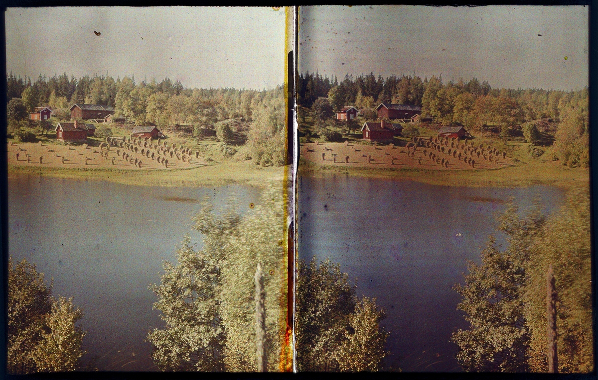 Lumières-stereo-autokromer. Landskap med en gård i bakgrunden.
