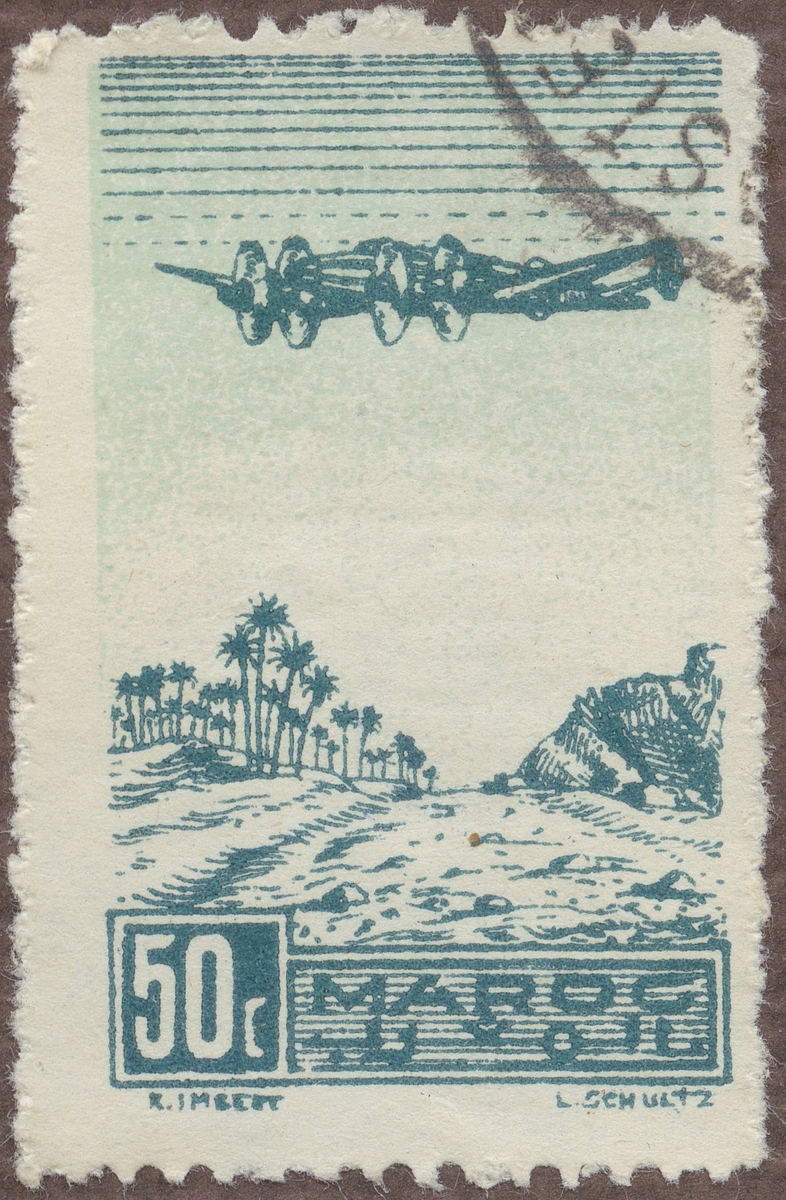 Frimärke från Franska Marocko, 1944. Motiv av Fyrmotorigt monoplan över Oas palmlandskap.