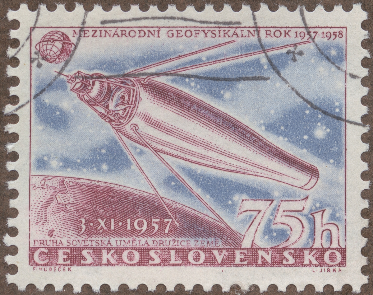 Frimärke från Tjeckoslovakien, 1957. Motiv av Andra ryska satelliten: "Sputnik" II. 3 november 1957. - "Minne om satelliten samt propagandamärke för Geofysiska året 1957-1958."