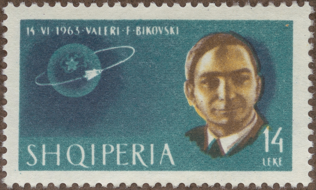 Frimärke från Albanien, 1963. Motiv av Rymdresa: 14 juni 1963: Ryssen Valeri F. Bikovski "-Astronaut Serie-"