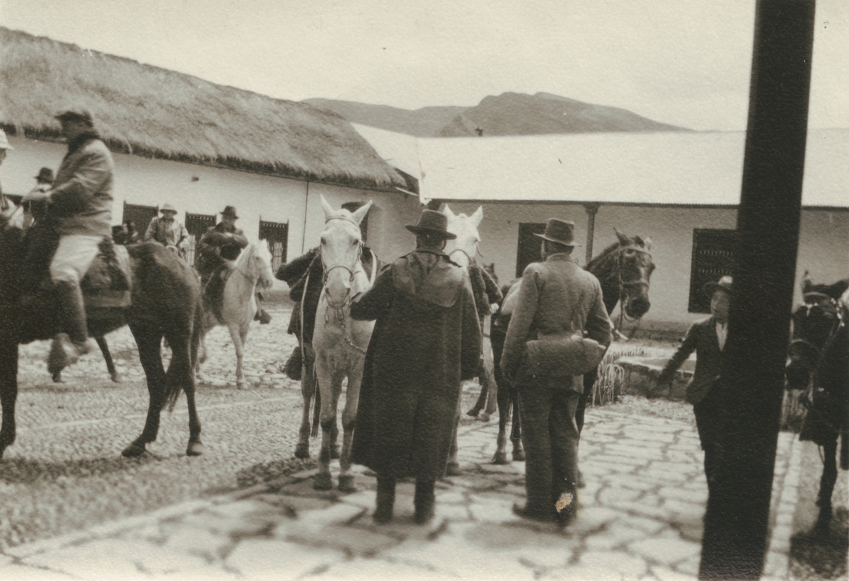 Fotografi från kuvert märkt med "Ernst Nordenskjöld". Motiv av expeditionsdeltagare och hästar på gård framför hus.