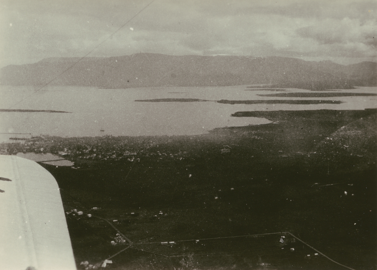 Fotografi från Albin Ahrenbergs resa till Grönland 1929. Vy över berg, vatten och landskap.