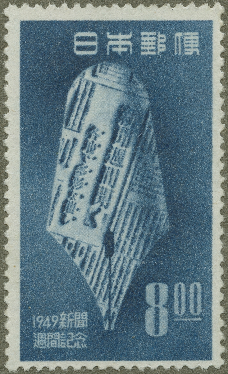 Frimärke från Japan, 1949. Motiv av Japansk tidningsmatris av 1949. Med anledning av pressens vecka.