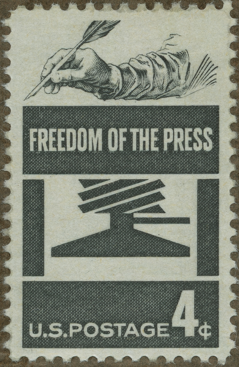 Frimärke från U.S.A., 1958. Motiv av Skrivande hand Primitiv tryckpress Symbol för pressfriheten -USA:s första Journalist college vid "University of Missouri" 50 år: 1908-1958.