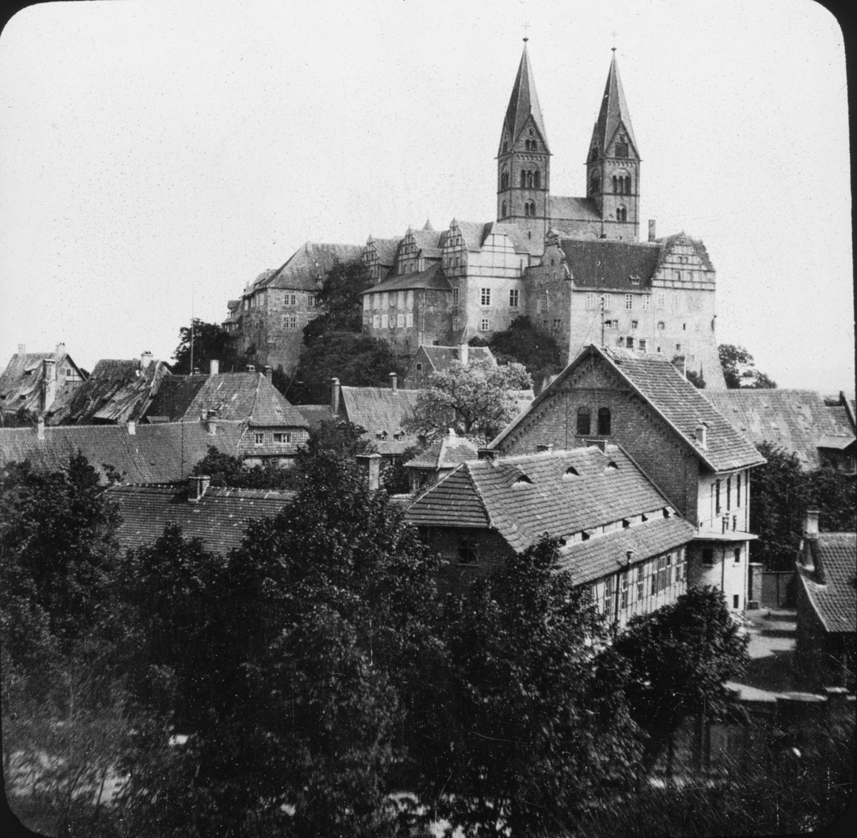 Skioptikonbild med motiv från Quedlinburg, på höjden syns Schloss Quedlinburg.