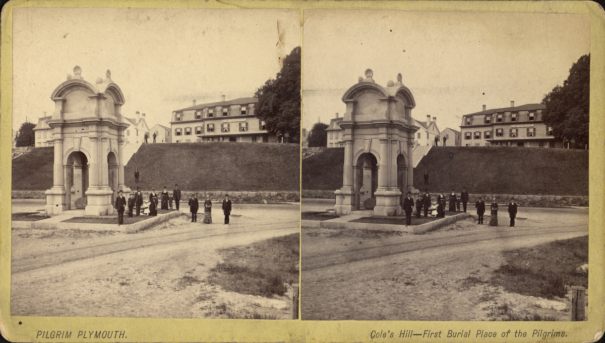 Stereobild av sällskap klädda i svart invid bergravningsplatsen Cole's Hill, Plymouth, Massachusetts.