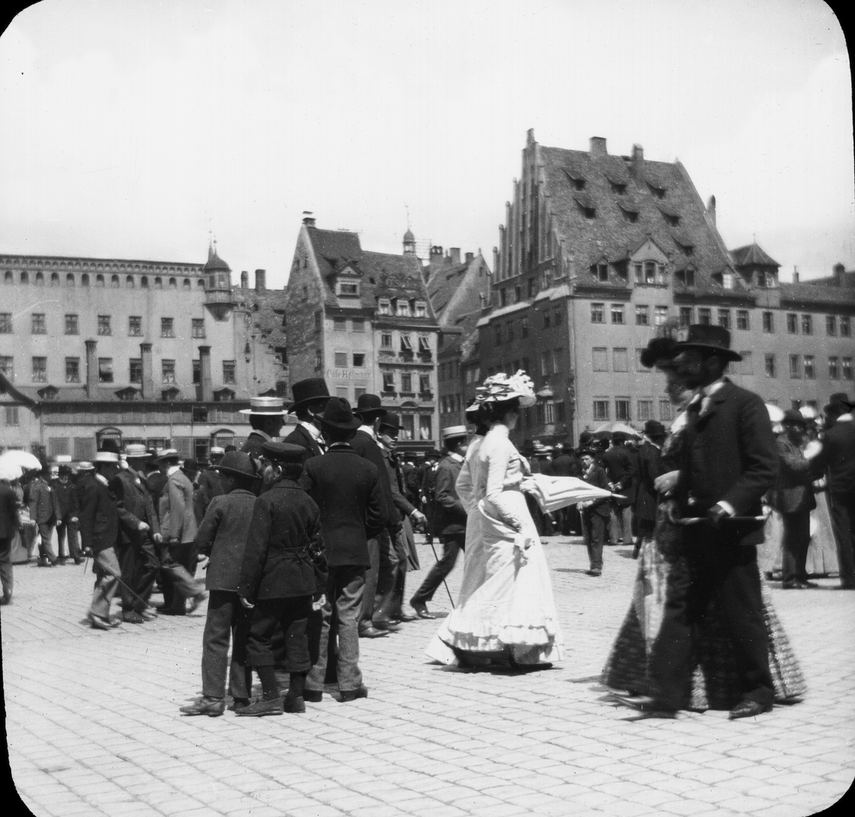 Skioptikonbild med motiv av folksamling på torget i Nürnberg.