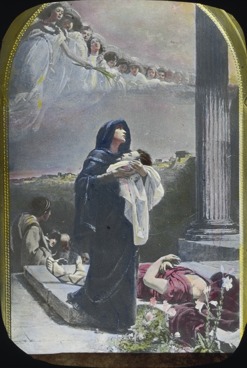 Kolorerad skioptikonbild med religiöst motiv. Kvinna med en mans huvud i famnen.