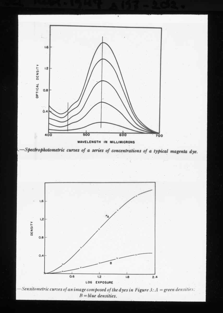 Övre bilden: Spektrofotometriska kurvor i en serie med koncentrationen av en typisk magentafärgämne. Undre bilden: Sensitometriska kurvor av en bild som är sammansatt av färgämnena i figuren ovan (den övrebilden). A=gröndensiteter# B=blå densiteter.