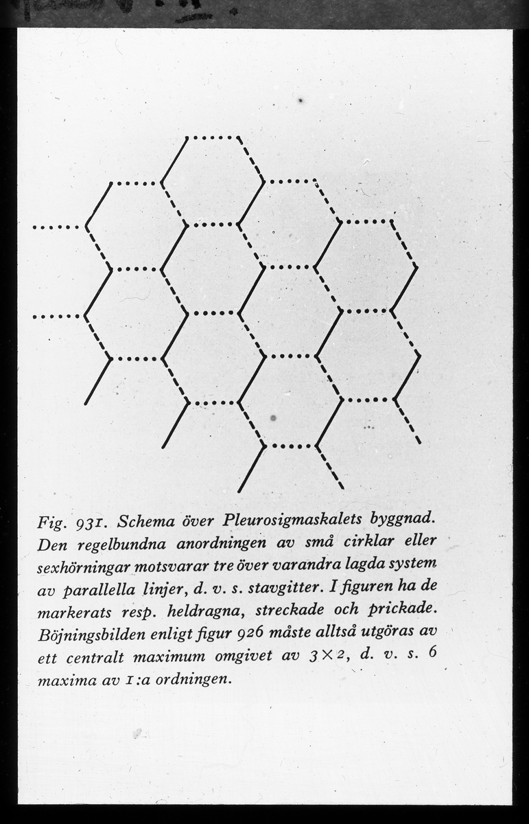 Schema över Pleurosigmaskalets byggnad. Den regelbundna anordningen av små cirklar eller sexhörningar motsvarar tre över varandra lagda system av parallella linjer, d.v.s. stavgitter. I figuren ha de markerats resp. heldragna, streckade och prickade.
