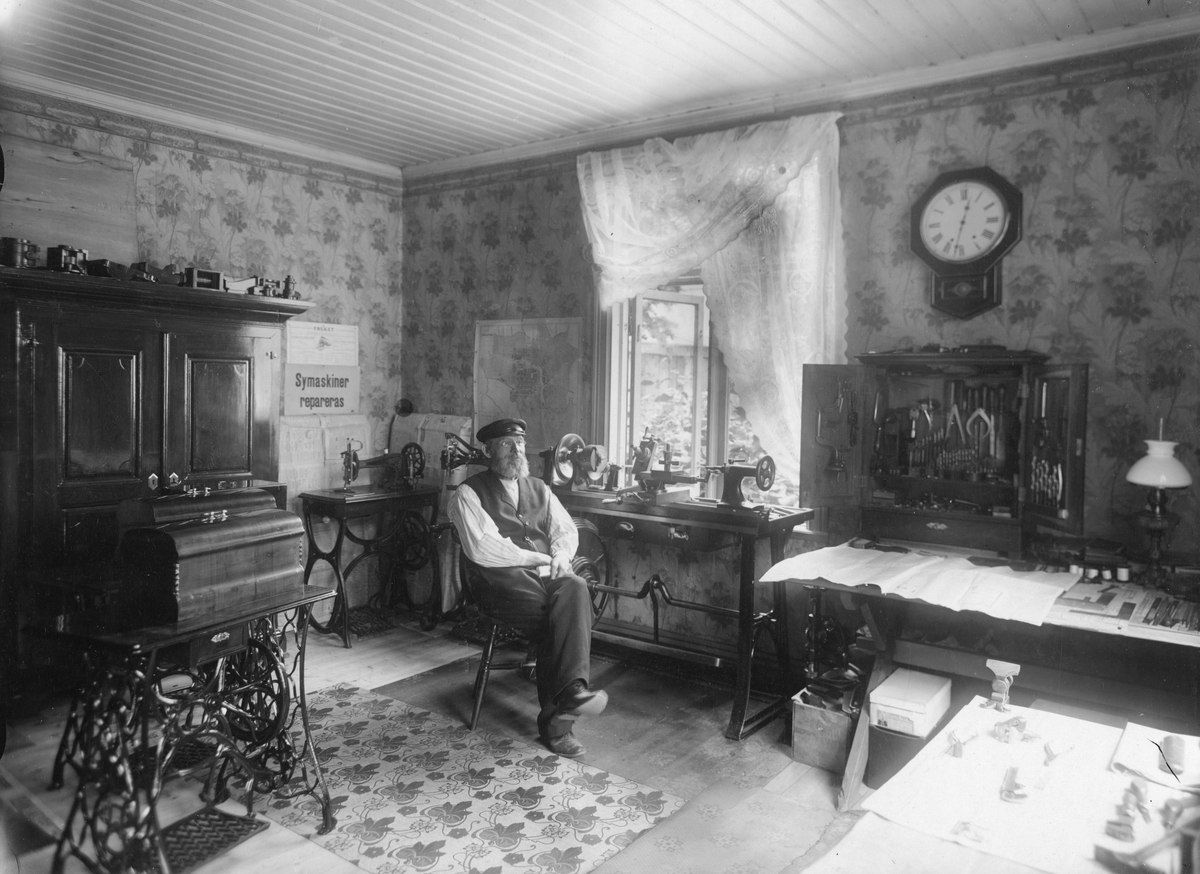 Montör Granströms bostad med "reparationsverkstad". Granström var anställd vid "verktygsskåpet" vid Munktells i Eskilstuna. Fotot är troligen taget på 1920-talet.
