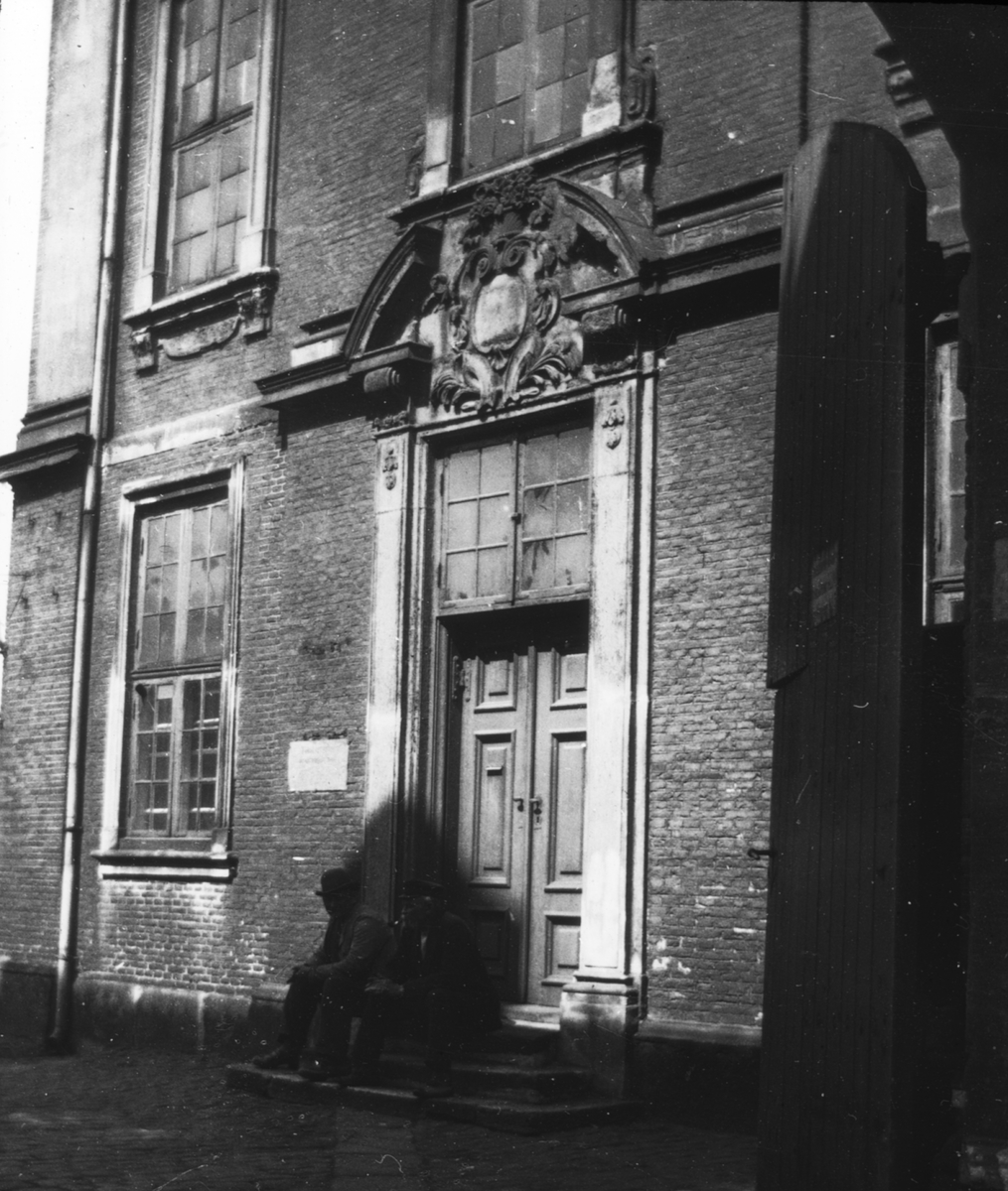 Skioptikonbild med motiv två män sittande utanför okänd port i Köpenhamn.