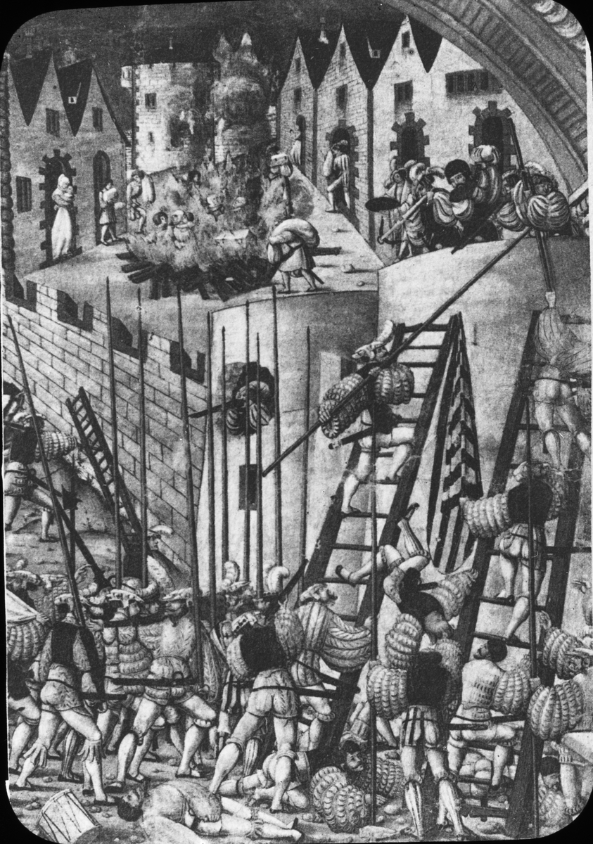Bilden har förvarats i kartong märkt: Resan 1908. Stein am Rhen. XIII. 6. Text på bild: "Kloster St. Georgen. Gemäldesaal. Eroberung om Saguni 1516".