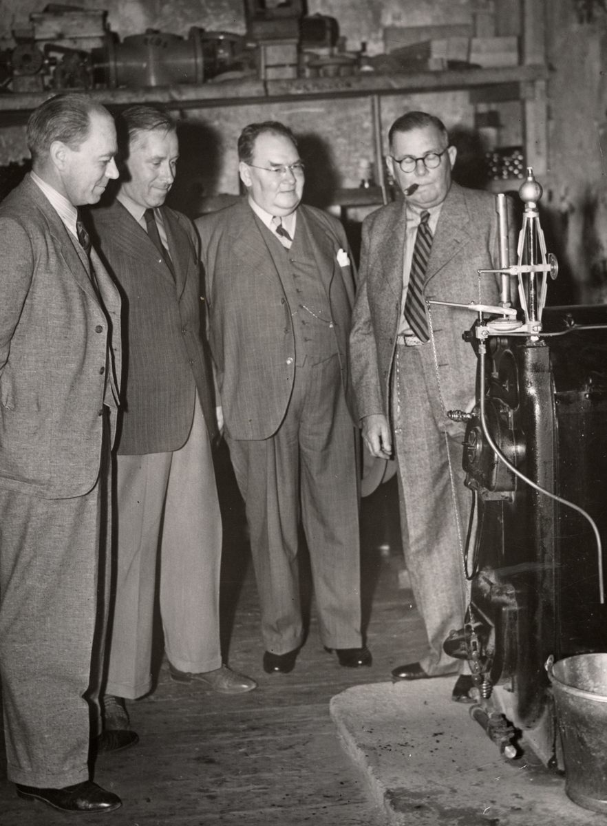 Från vänster: Ingenjör M. Norell, Bränslekommisionen, Professor Lage Malm, Ingenjör C.A. Hammarwall V.V.S. samt ingenjör Ragnar Carlstedt, uppfinnare av intermitenta dragregulatorns för vedeldning i värmeledningspannor. BIlden är tagen vid demontrationen 1941 på Bangårdsgatan12, Stockholm.