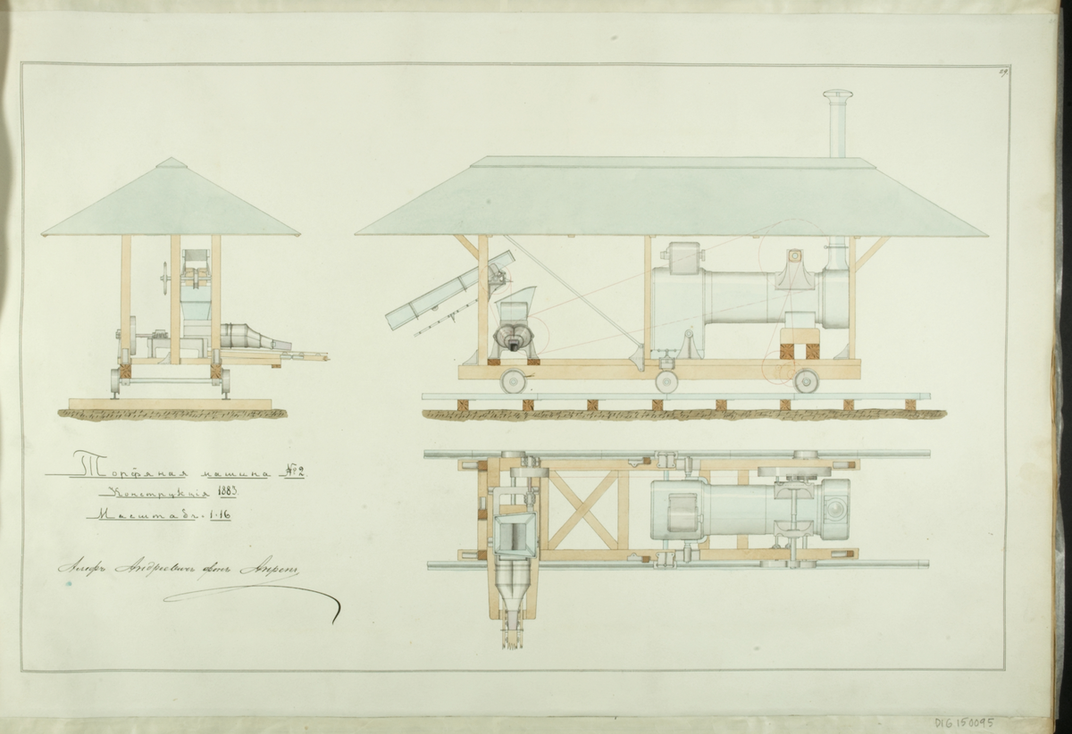 Skiss på ryska 1883, ur boken med ritningar mm 1868-1887, av den svenske torvmaskinkonstruktören Aleph Anrep.