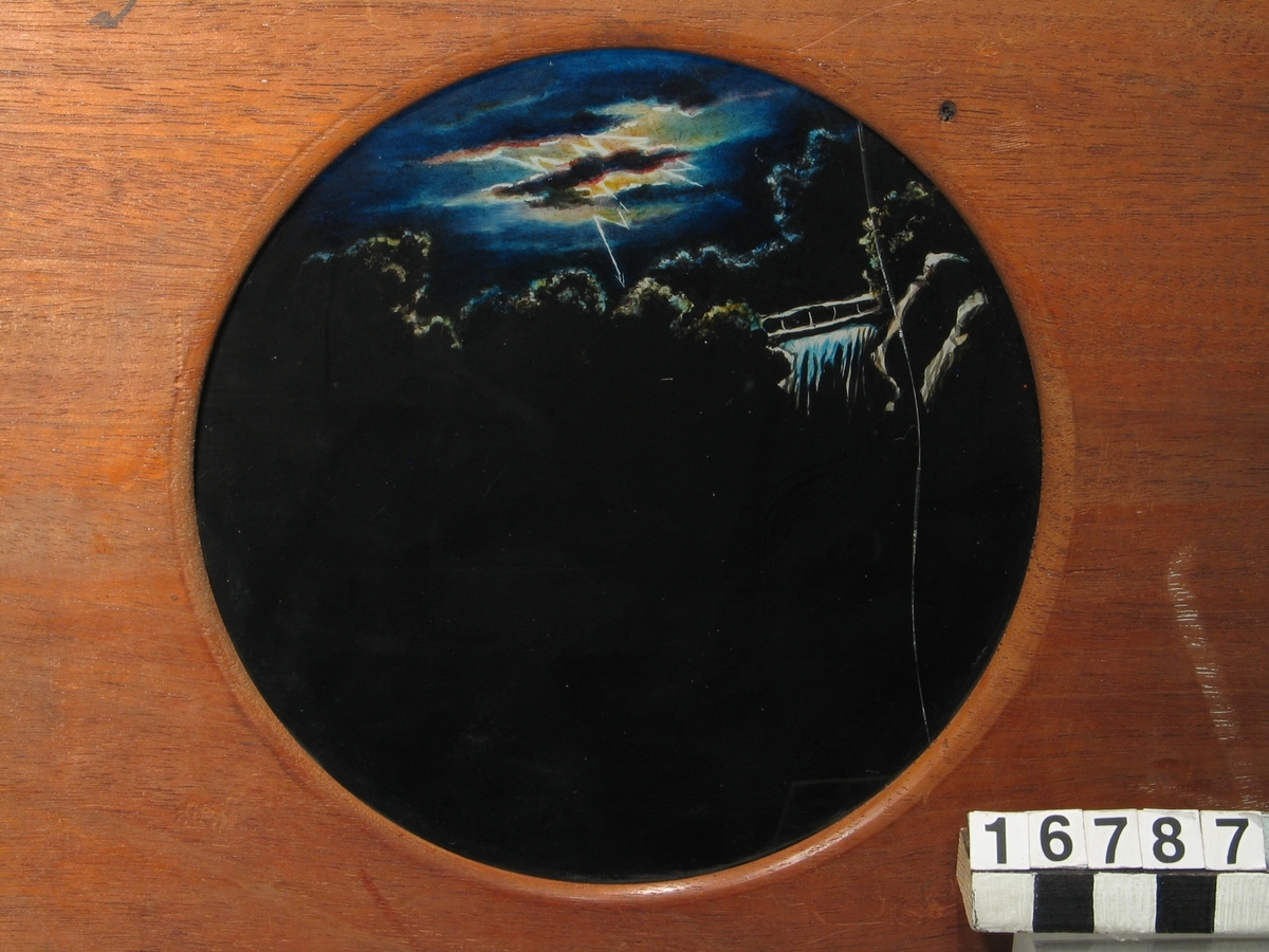 Laterna magica bild, handmålad på glas. "Friskÿtten". Vattenfall i natten.