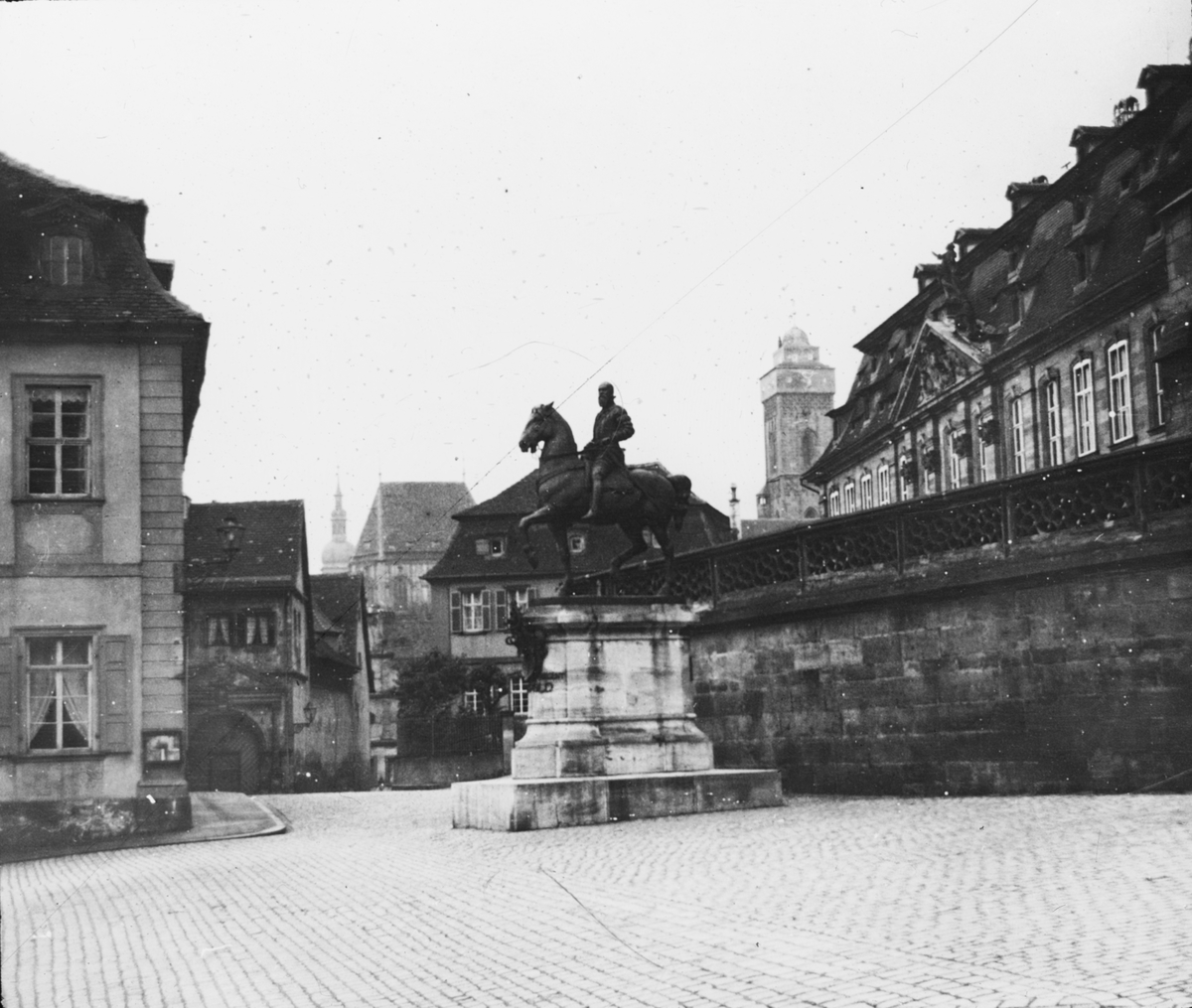 Skioptikonbild med motiv av okänd staty på torg i Bambeg.