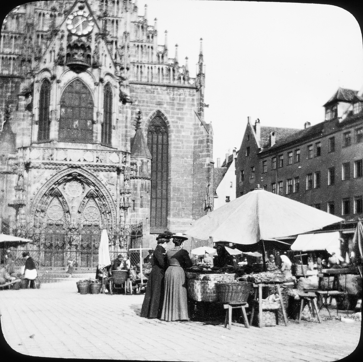 Skioptikonbild med motiv av marknad på torget framför Frauenkirche i Nürnberg.