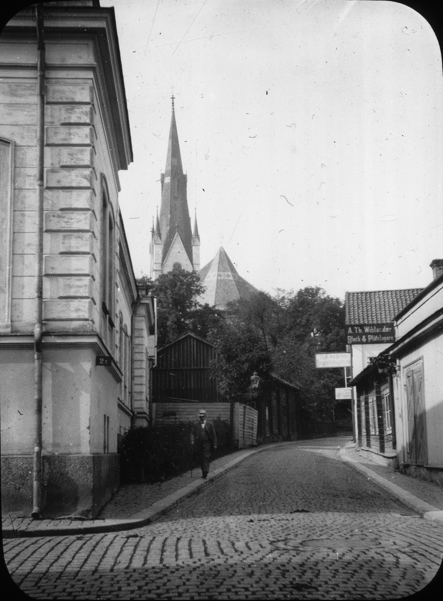 Skioptikonbild med motiv från Linköping. I bakgrunden syns tornet på Linköpings Domkyrka.