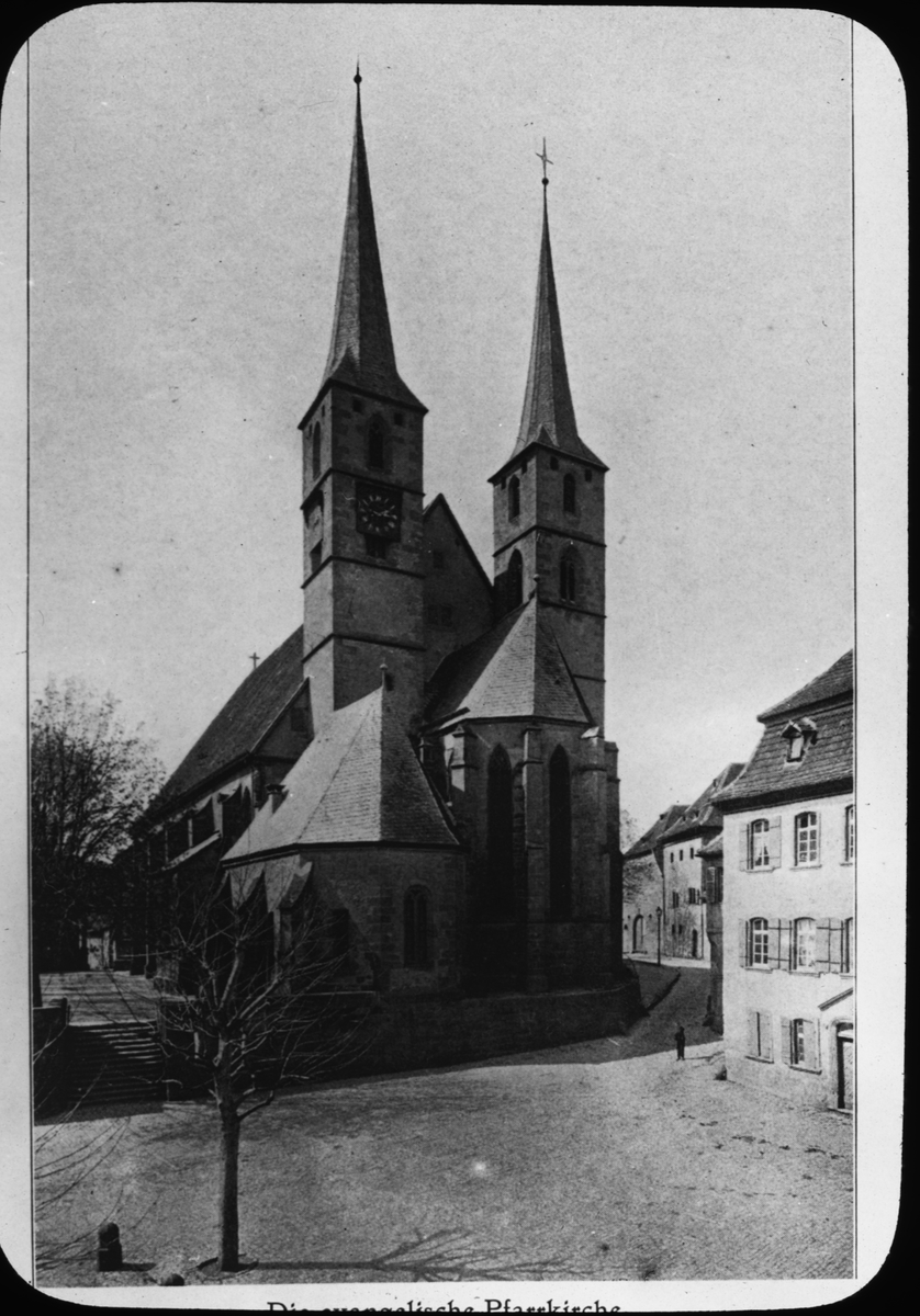 Skioptikonbild med motiv av tryckt bild, vykort, av Evangelische pfarrkirche.