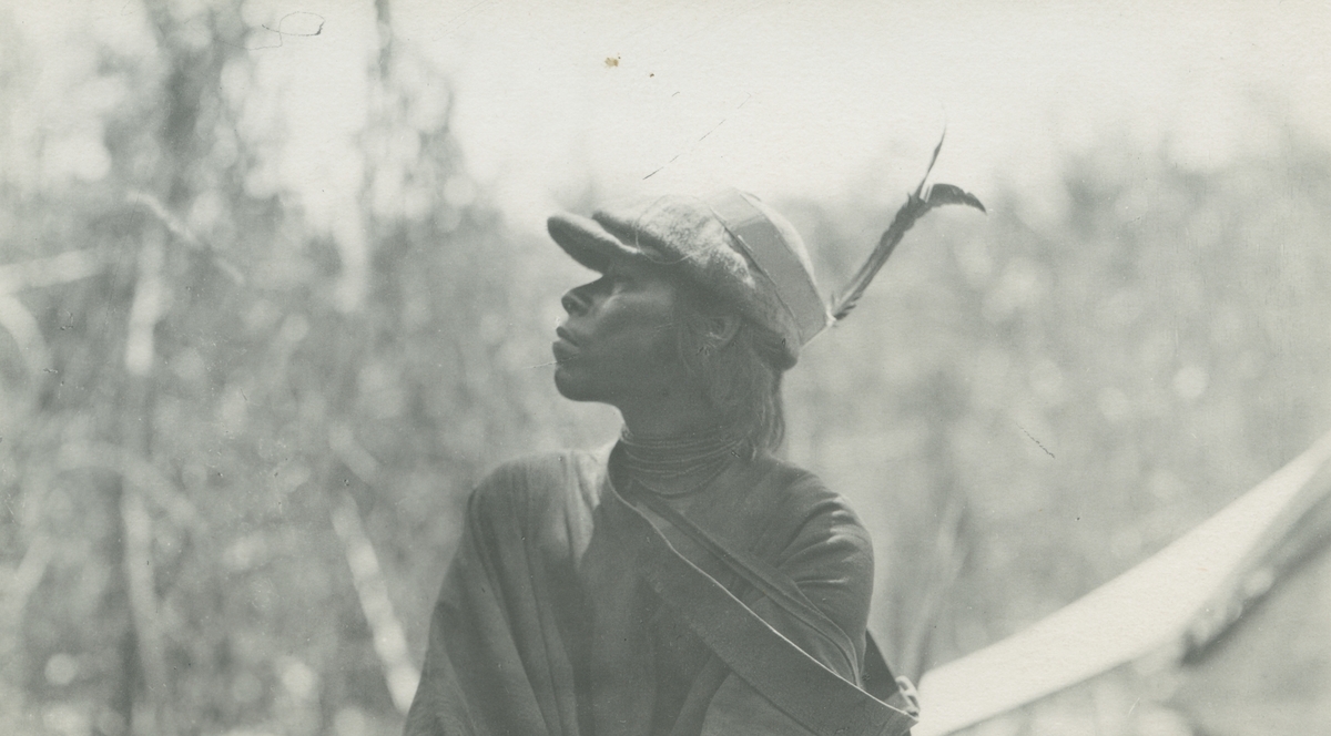 Fotografi från Peruexpedition 1920. Porträtt av man med fjäderprydd keps på huvudet.