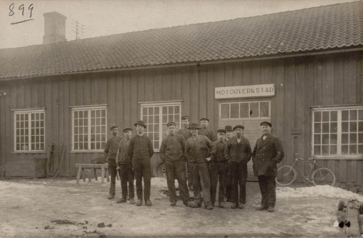 Personalen vid Lidans Motorverkstad, Lidköping, framför de gamla verkstadslokalerna, omkring 1915.