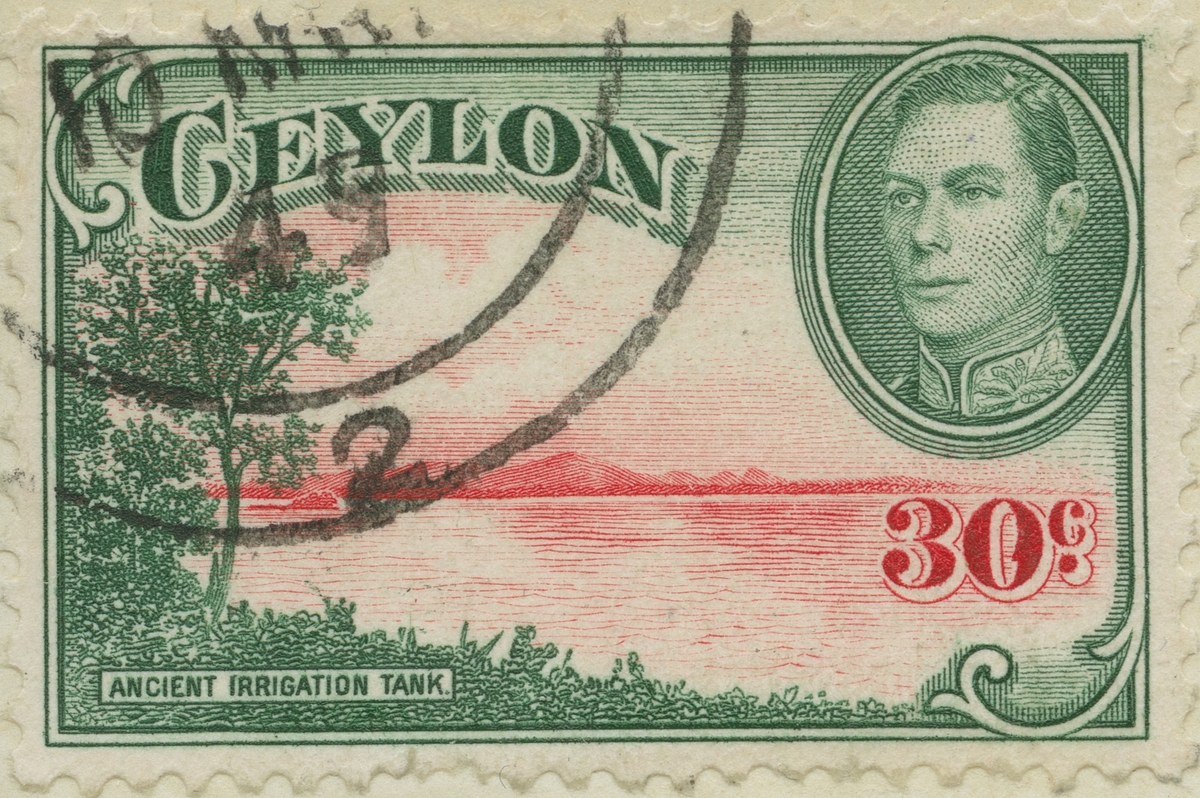 Frimärke ur Gösta Bodmans filatelistiska motivsamling, påbörjad 1950. Frimärke från Indien Ceylon, 1937. Motiv av Irrigationssjö Kung George VI.