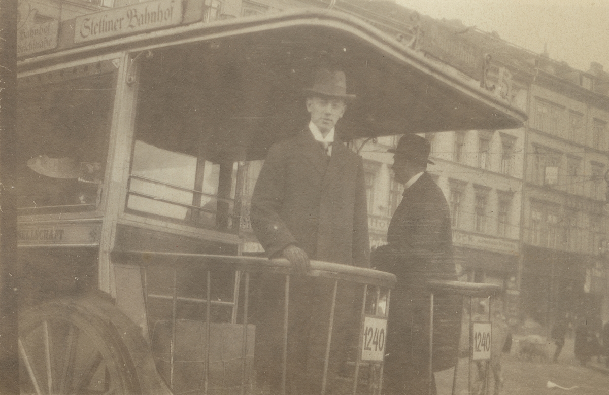 Fotografi från expedition till Spetsbergen. Motiv av ung man på spårvagn. På spårvagnen står "Stettiner Bahnhof" vilket är en järnvägscentral i Berlin som invigdes 1842. Numera har Stettiner Bahnhof bytt namn till Nordbahnhof.