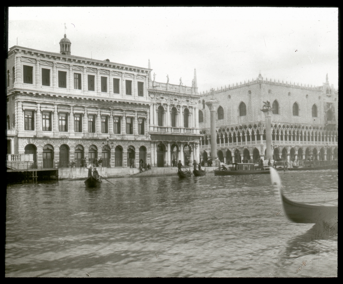 Skioptikonbild från institutionen för fotografi vid Kungliga Tekniska Högskolan. Motiv från Venedig. Till höger i bild ses Doge palatset (Palazzo Ducale) Bilden är troligen tagen av John Hertzberg under en resa i Europa.