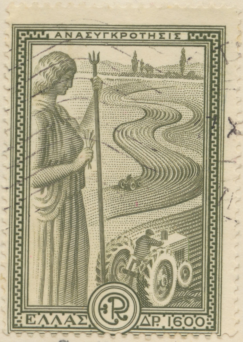 Frimärke från Grekland, 1953. Motiv av Plöjning med Traktor