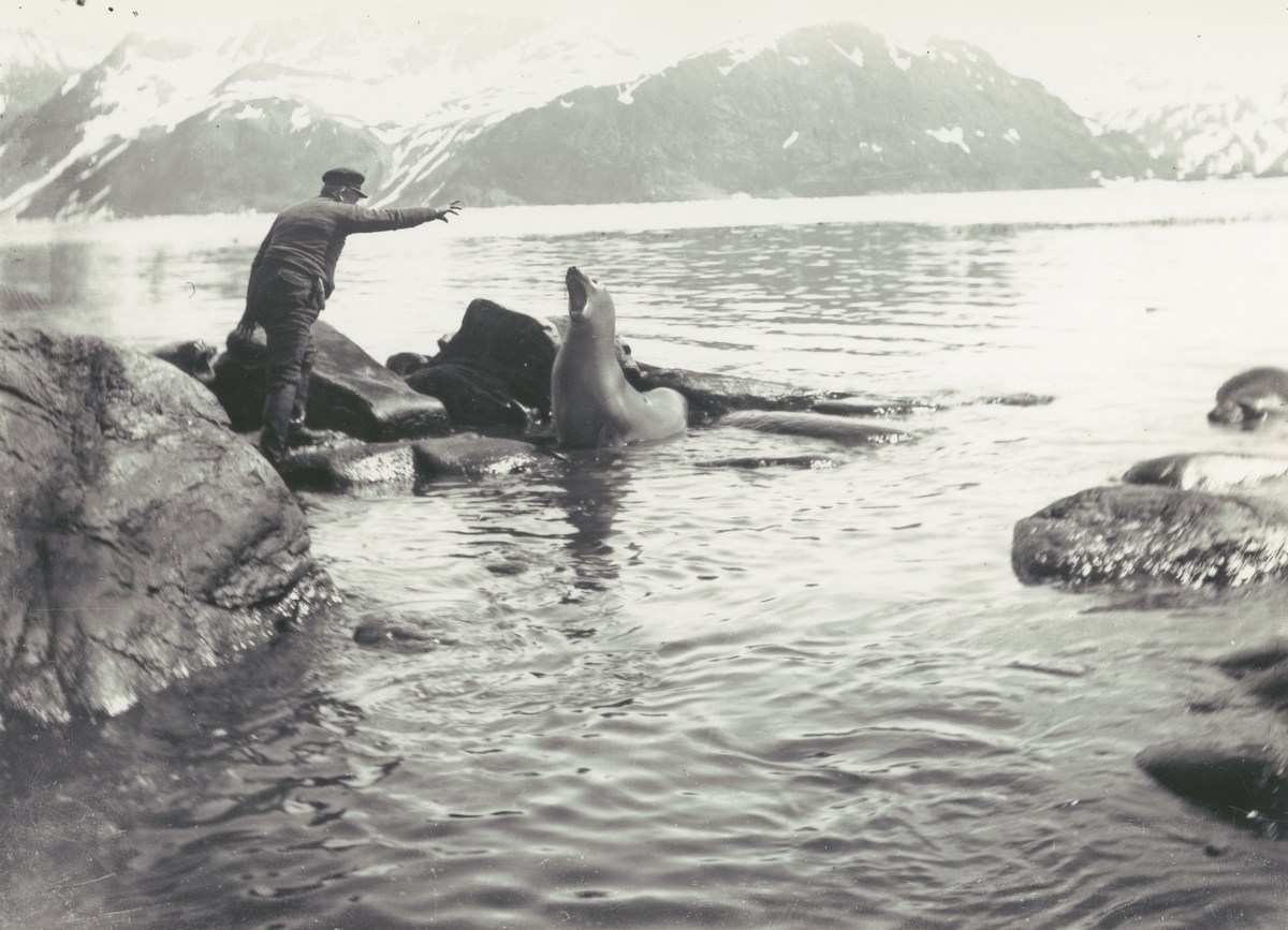 Bild från expedition i Antarktisområdet. Motiv av man och sjöelefant, Sydgeorgien 1912.