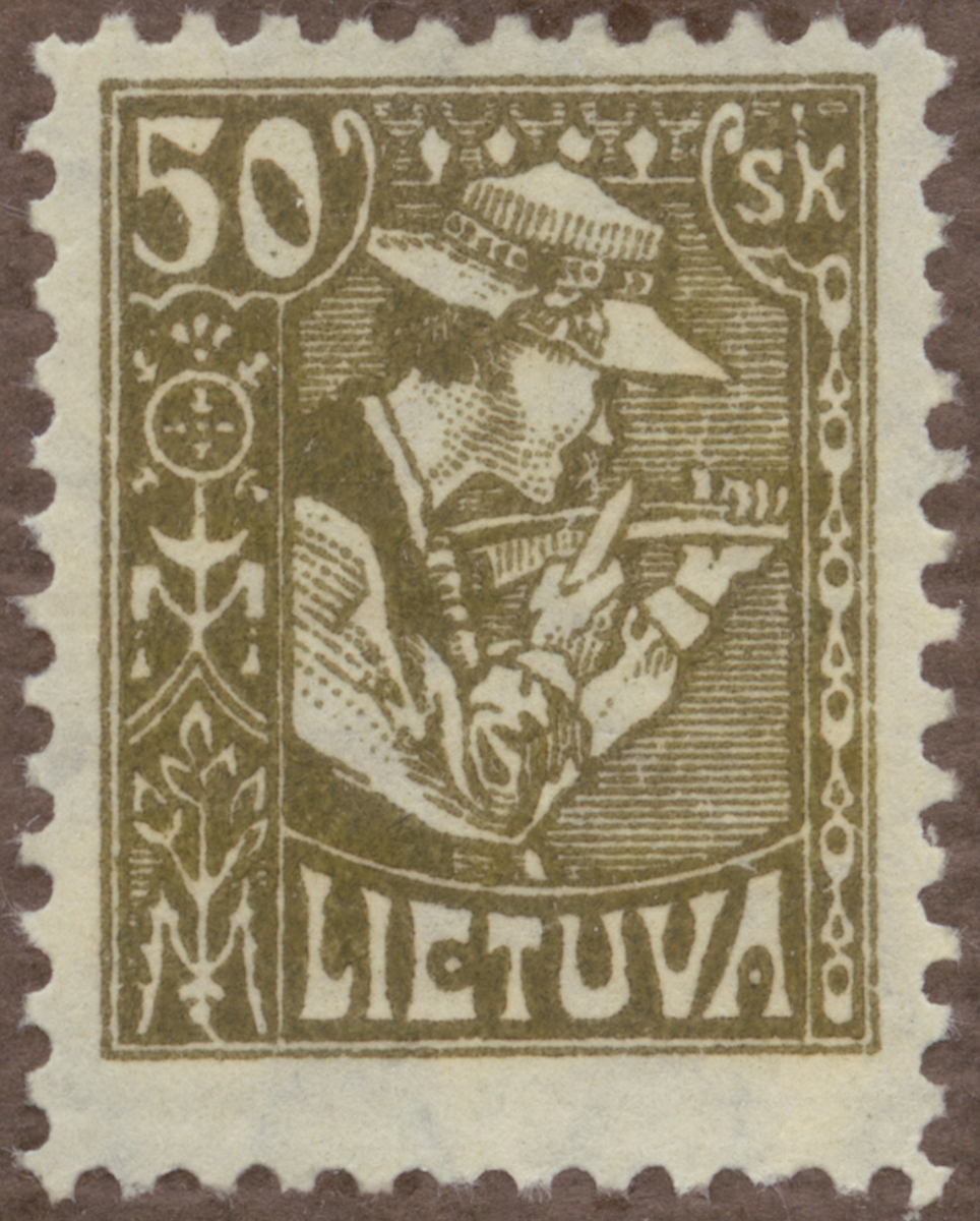 Frimärke från Litauen, 1921. Motiv av Litauisk skördeman vässande sin lie