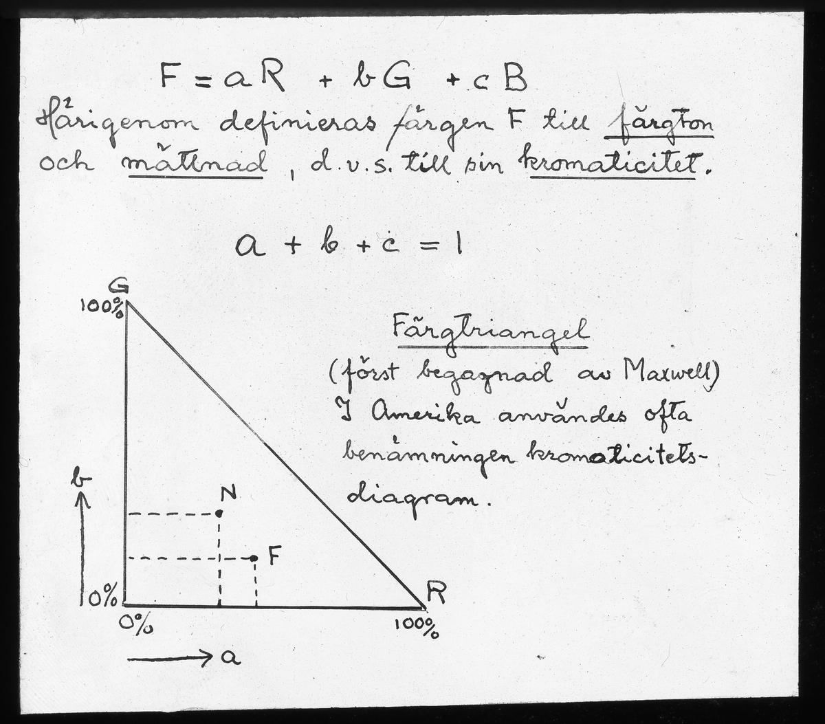Skioptikonbild från institutionen för fotografi vid Kungliga Tekniska Högskolan. Använd av professor Helmer Bäckström som föreläsningsmaterial. Bäckström var Sveriges första professor i fotografi vid Kungliga Tekniska Högskolan 1948-58. Motiv föreställande "Färgtriangel (först begagnad av Maxwell). I Amerika användes ofta benämningen kromaticitetsdiagram." (För mer text se bilden). För mer info se: Bäckström, Helmer. Fotografisk Handbok. Andra omarbetade upplagan. Natur och Kultur. Stockholm 1958-59. Se Kap.128.Trikolorimetri stycke 3. Blandning av färger s. 961 och följande.
