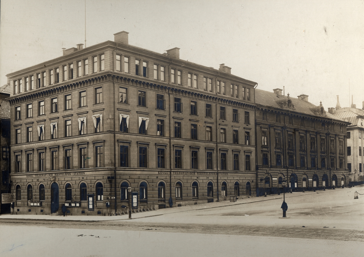 Fotografi ur album tillhörande Ester Holmberg, anställd vid Telegrafstyrelsens statistikavdelning 1902. Fotografierna troligen tagna 1907. Kungliga Telegraf- och Rikstelefons statiation i Gamla Stan.
