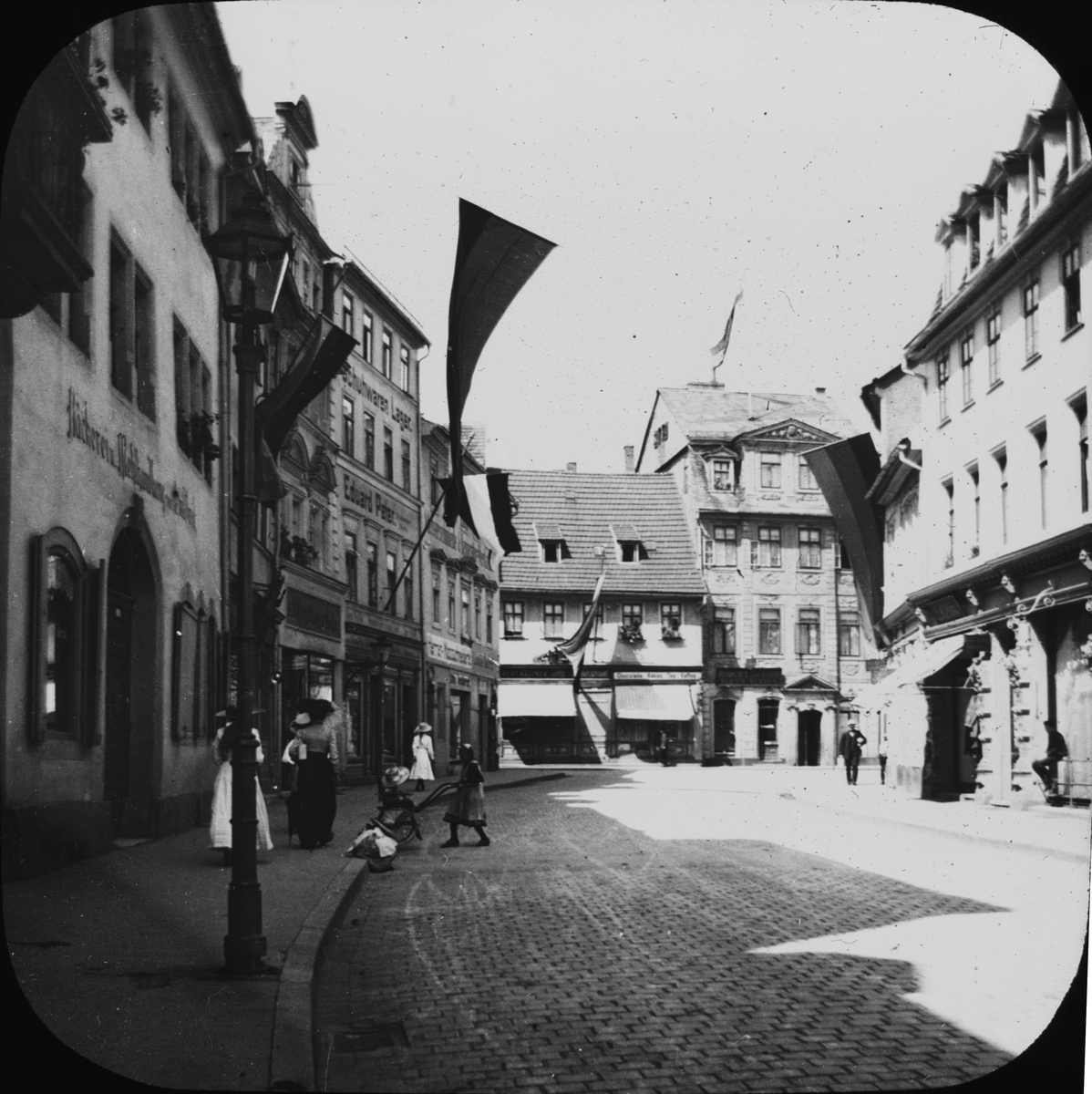 Titel: Skioptikonbild med motiv av gata i Weimar. Bilden har förvarats i kartong märkt: Vårresan 1910. Weimar 8. III.