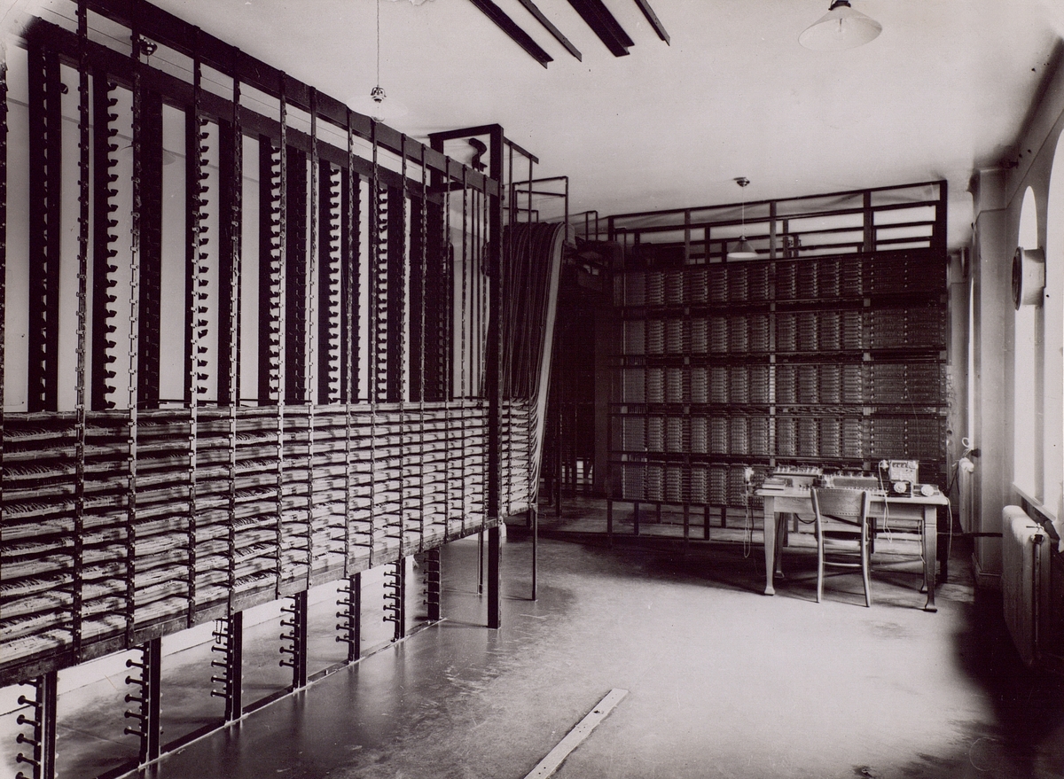 Sundsvalls telefonstation omkring 1929. Mellankopplingsstativ och undersökningsbord.