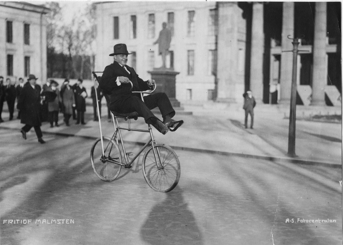 Fritiof Malmsten med sin nyhet gungcykeln på Karl Johans torg, Kristiania (Oslo).