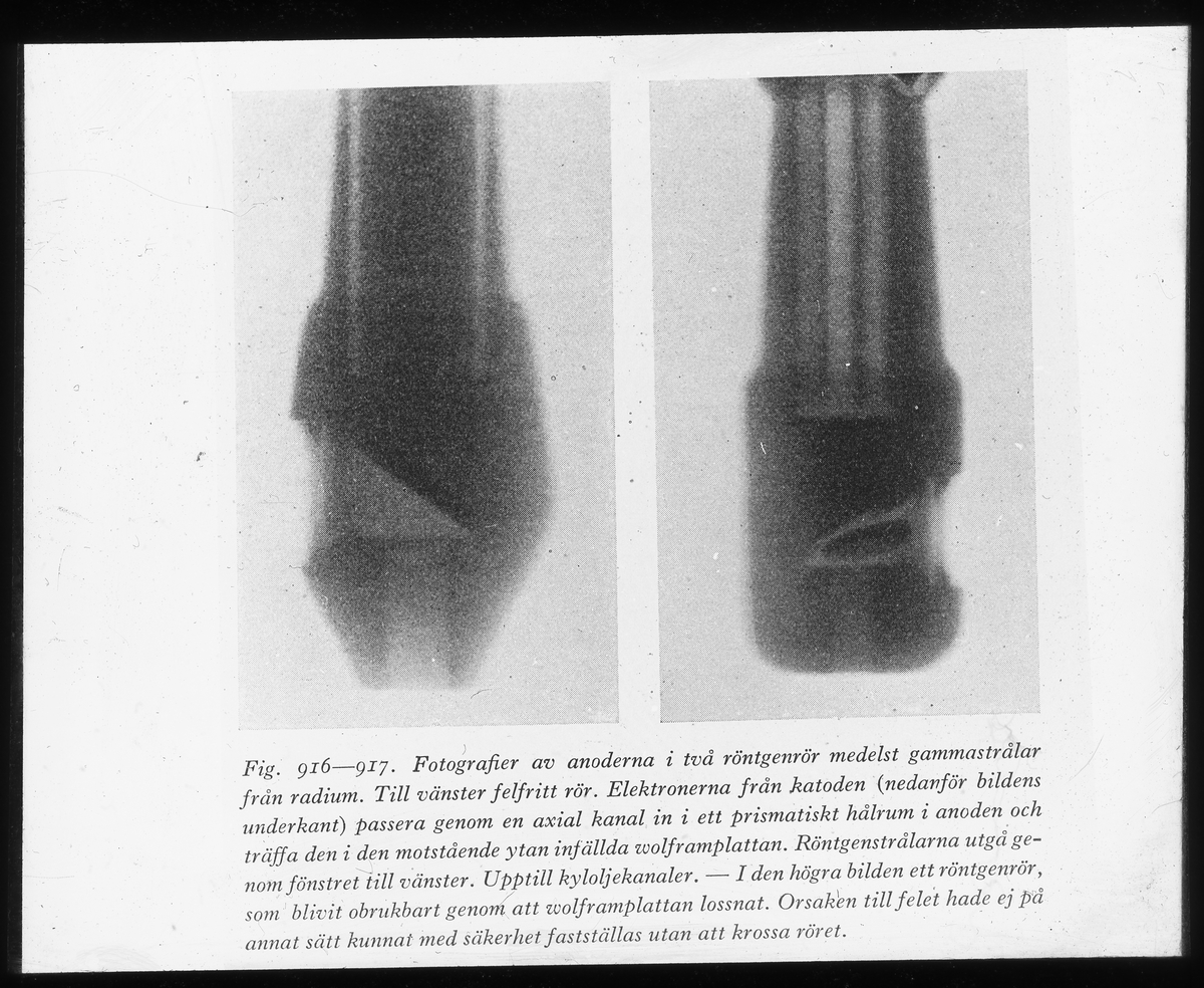 Fotografier av anoderna i två röntgenrör medelst gammastrålar från radium. Till vänster felfritt rör. Till höger har har röntgenröret blivit obrukbart då wolframplattan lossnat.
